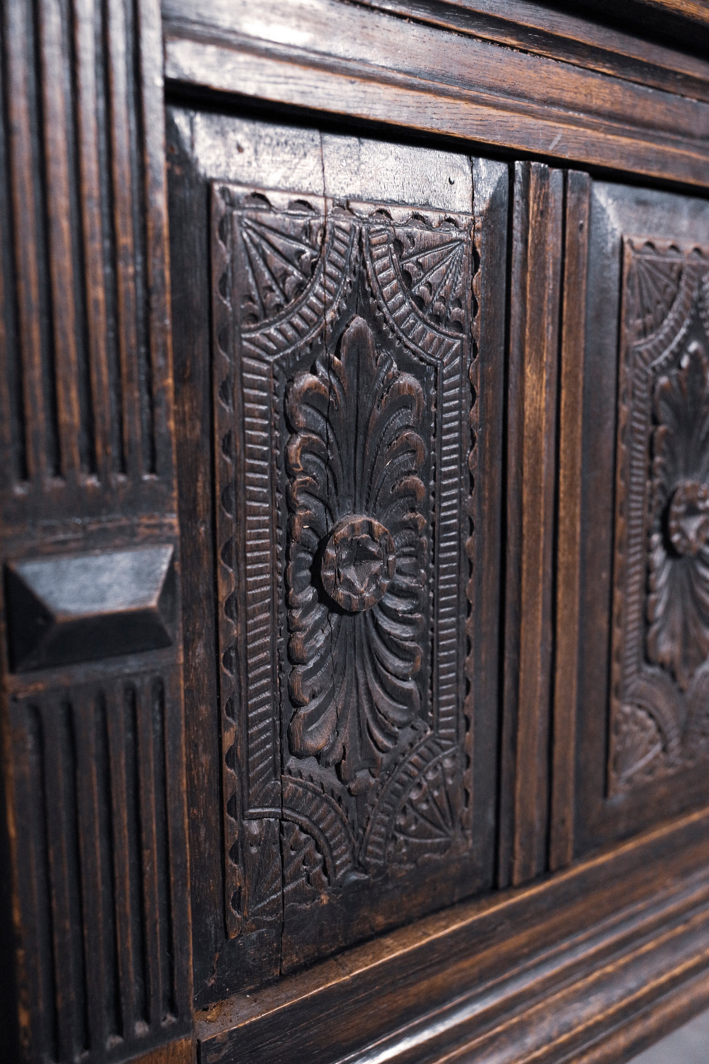 正面には細やかなレリーフが施され芸術性もありながら、引き出しや棚がついていて収納性にも優れています。