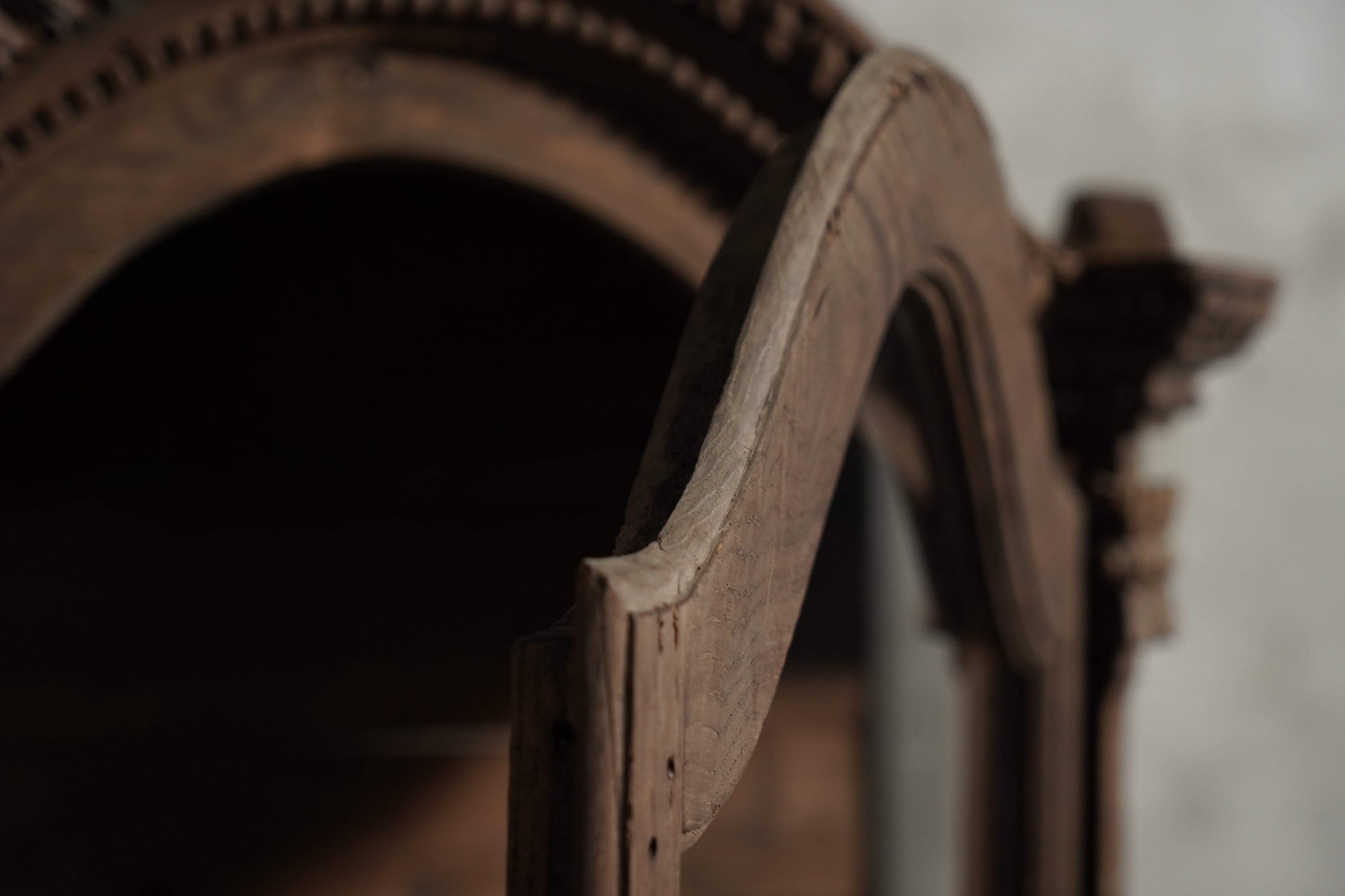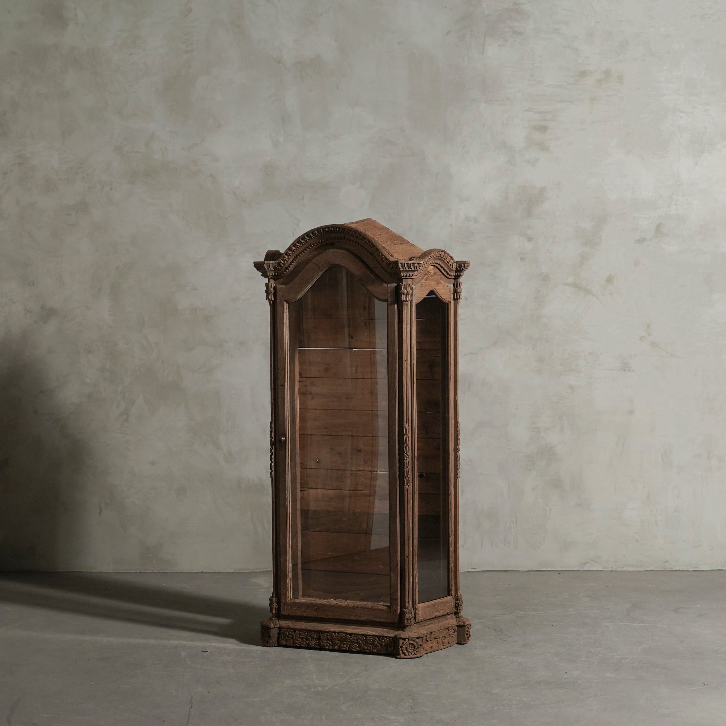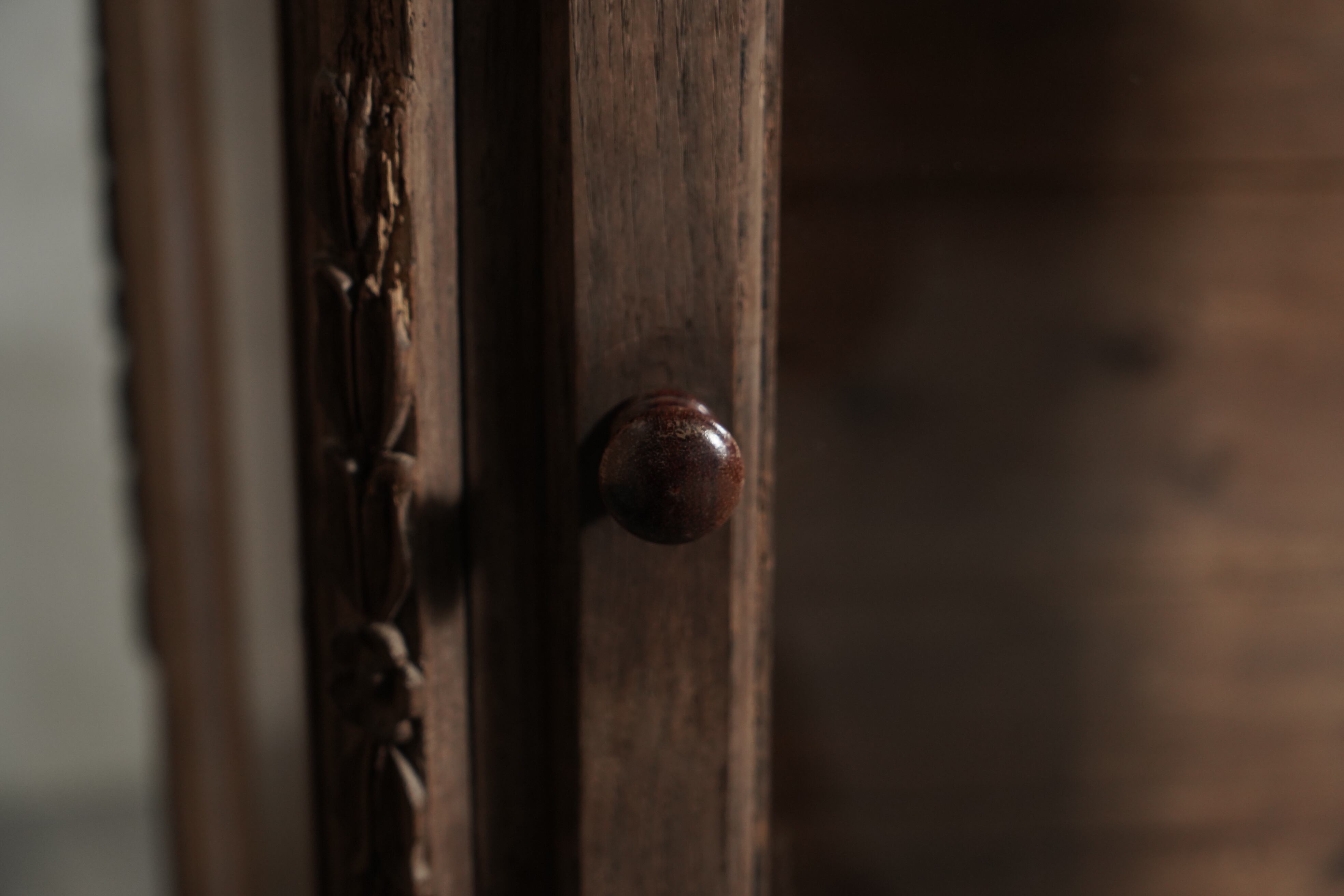 推定1860年代頃の大変古いお品で、オーク材の質感や装飾部分のエイジングから時代の変遷を感じられる、非常に味わい深いショーケースです。
