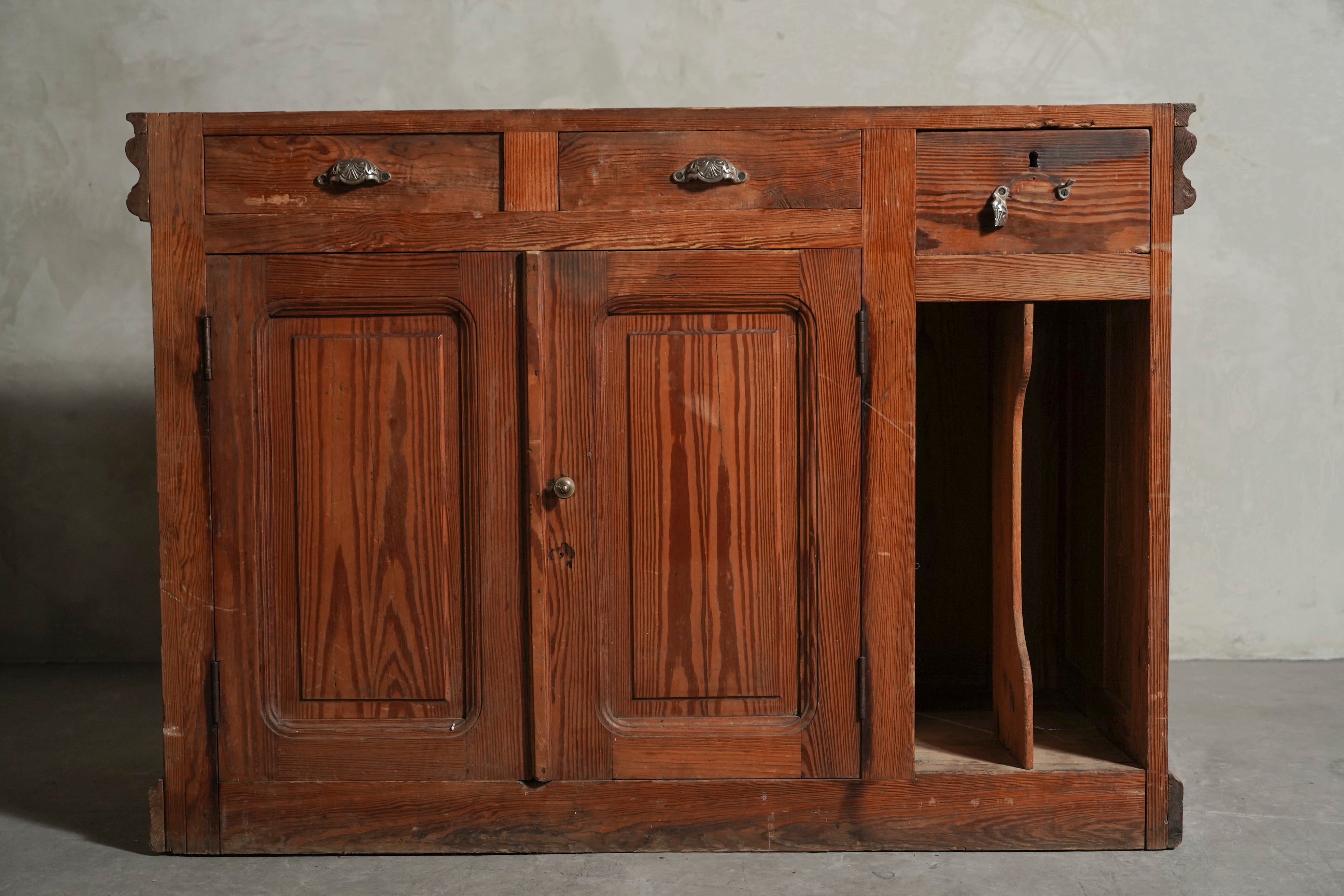 裏には収納スペースも多くあり実用性も高く、レジカウンターとして商品の受け渡しをしたりパンを並べたりと実際に使われていた様子が目に浮かびます。
