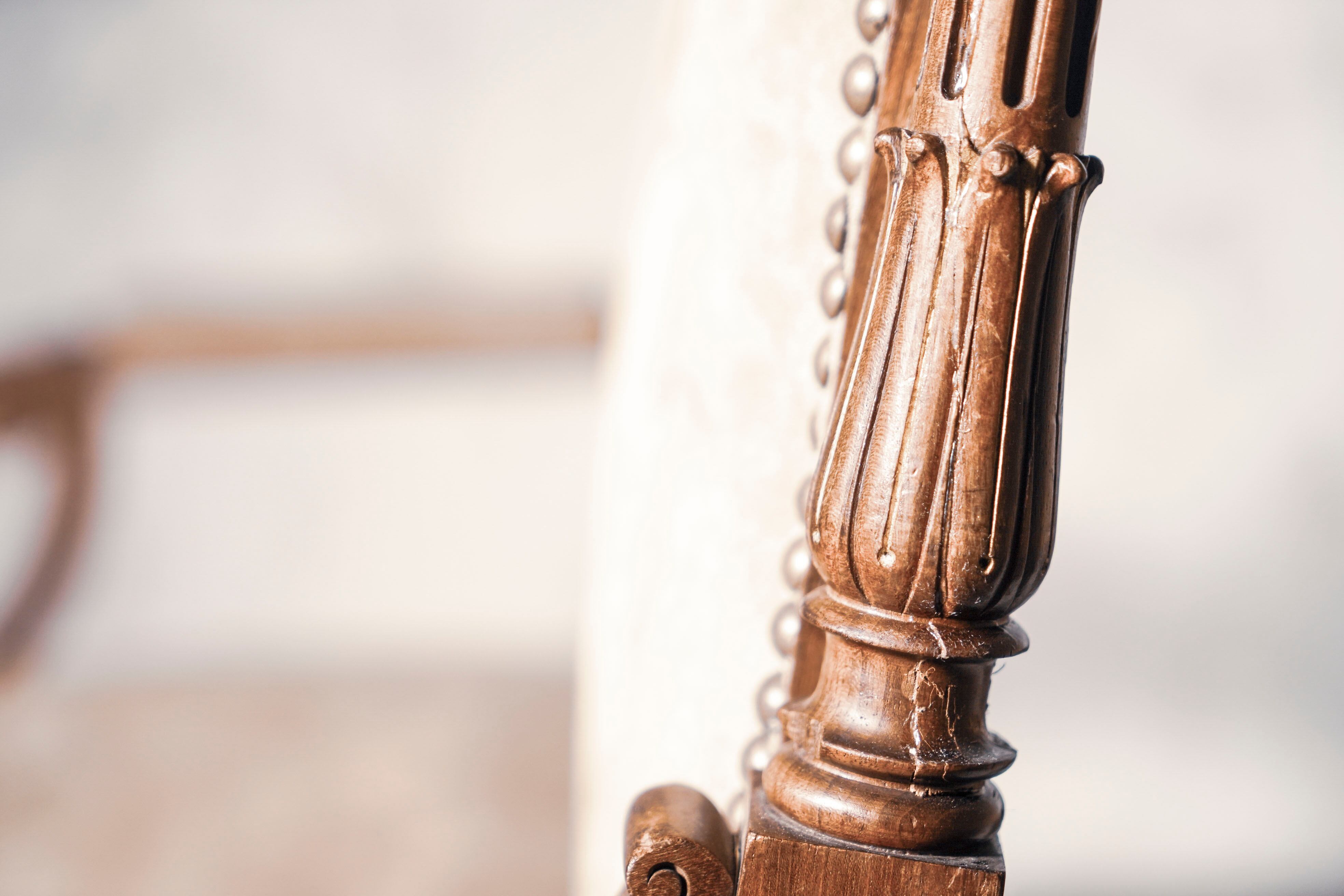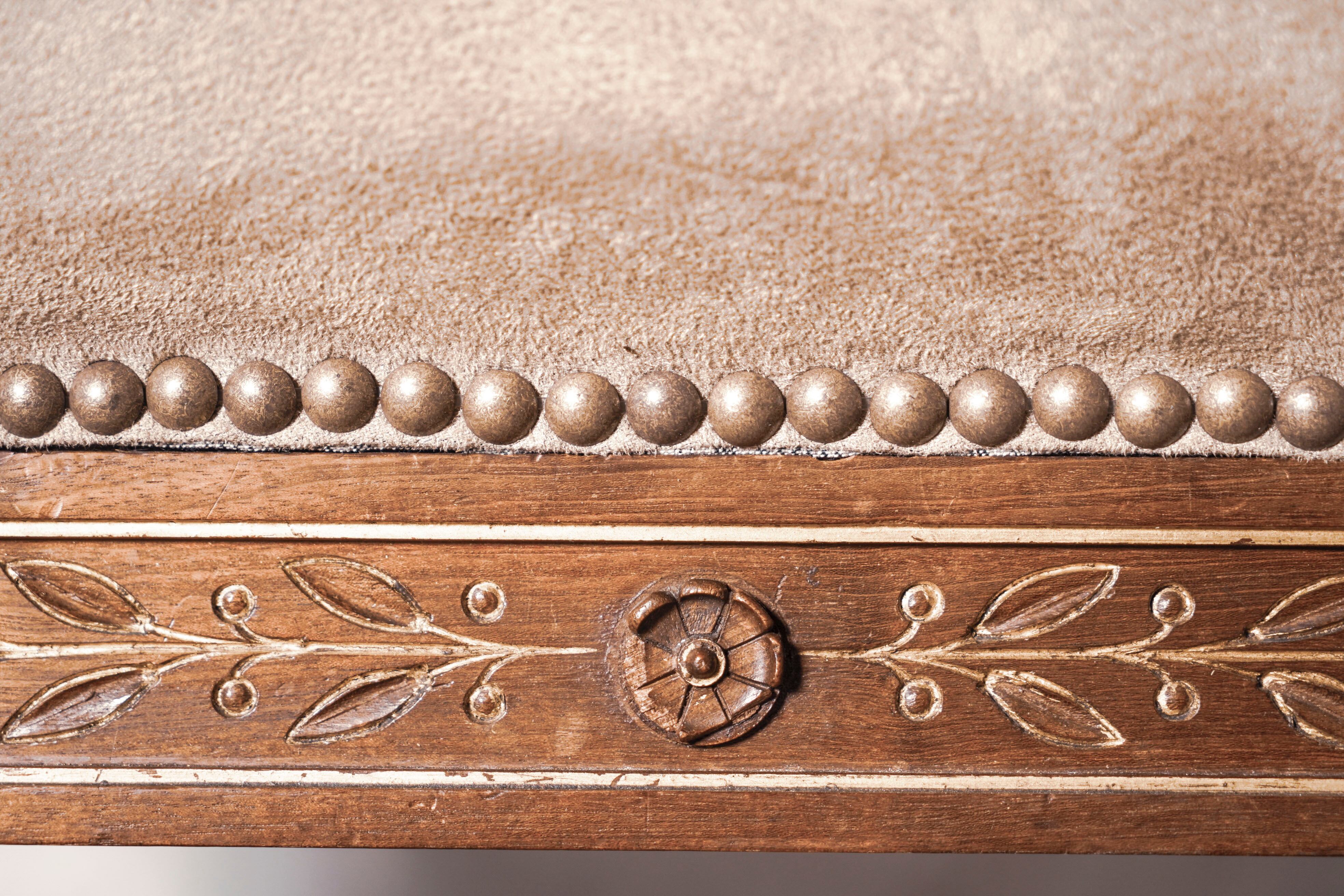 生地を留めているスタッズの装飾やフレーム部分の植物をモチーフにした彫りなど、細部に宿るデザインも魅力的でアンティークらしい雰囲気を際立てます。