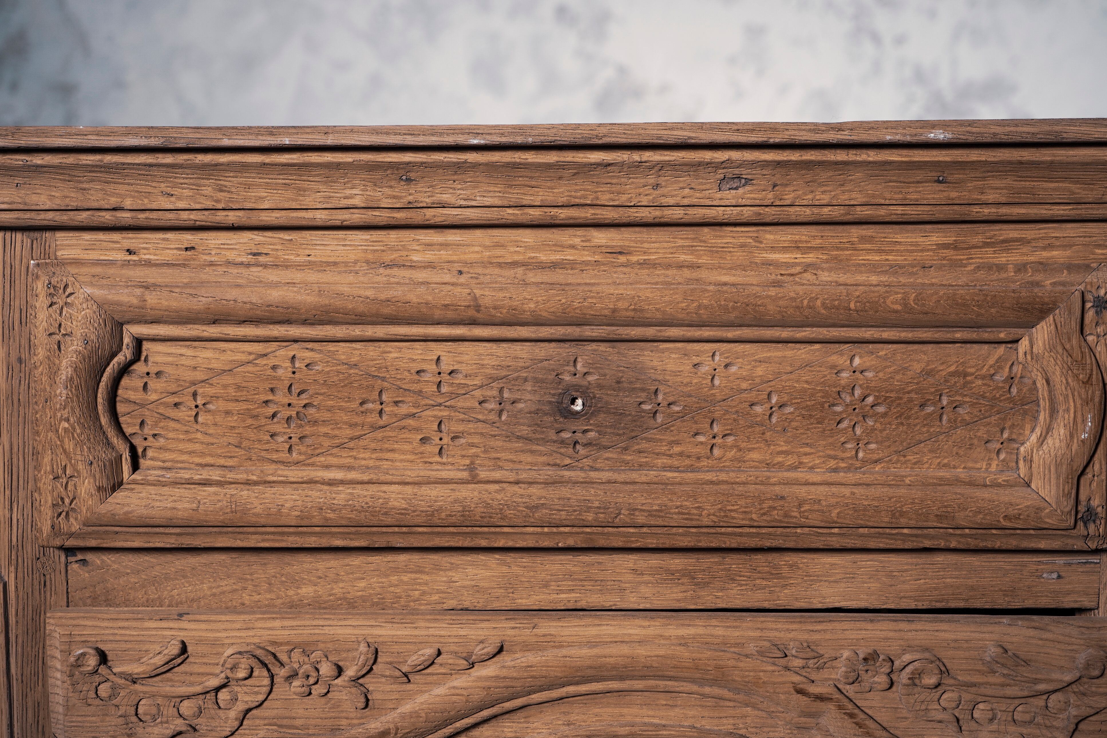 左右対称の植物モチーフのレリーフが美しく厳かで、独特の雰囲気を放つサイドボードです。