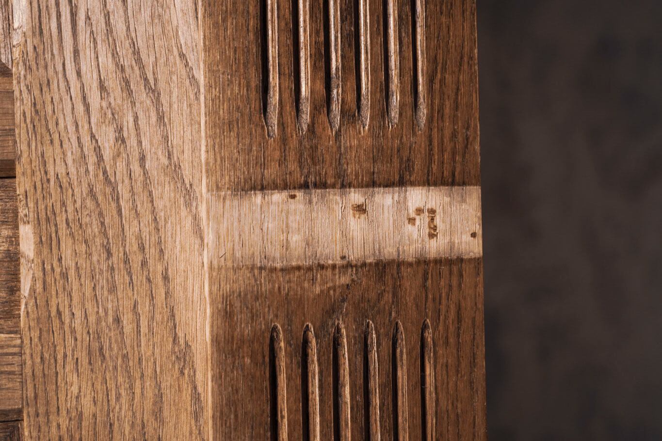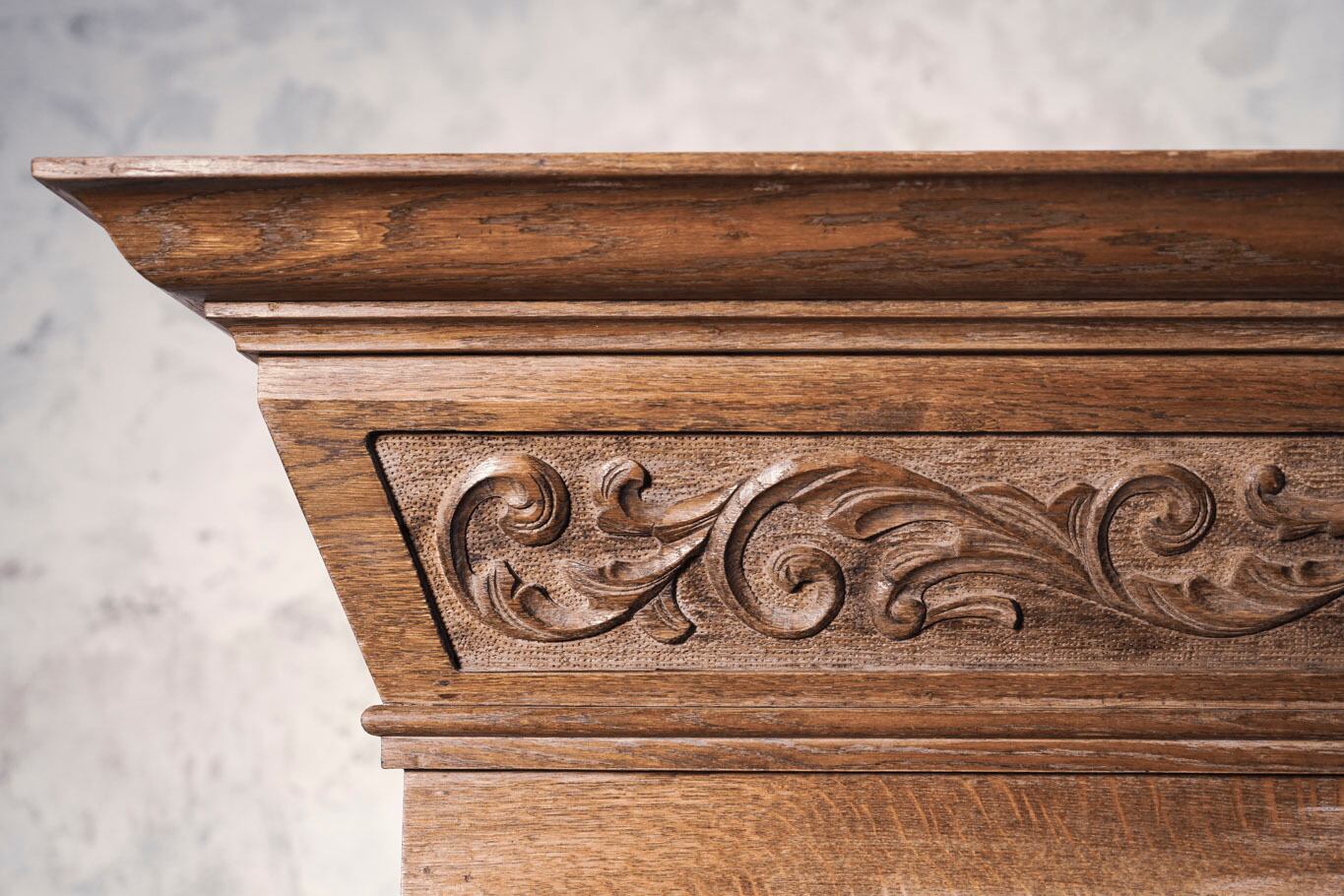 冠部分に施された曲線的な彫刻と、正面や側面に施された幾何学的な彫り模様が対照的で、その二つがよりこの家具を現代的に見せています。