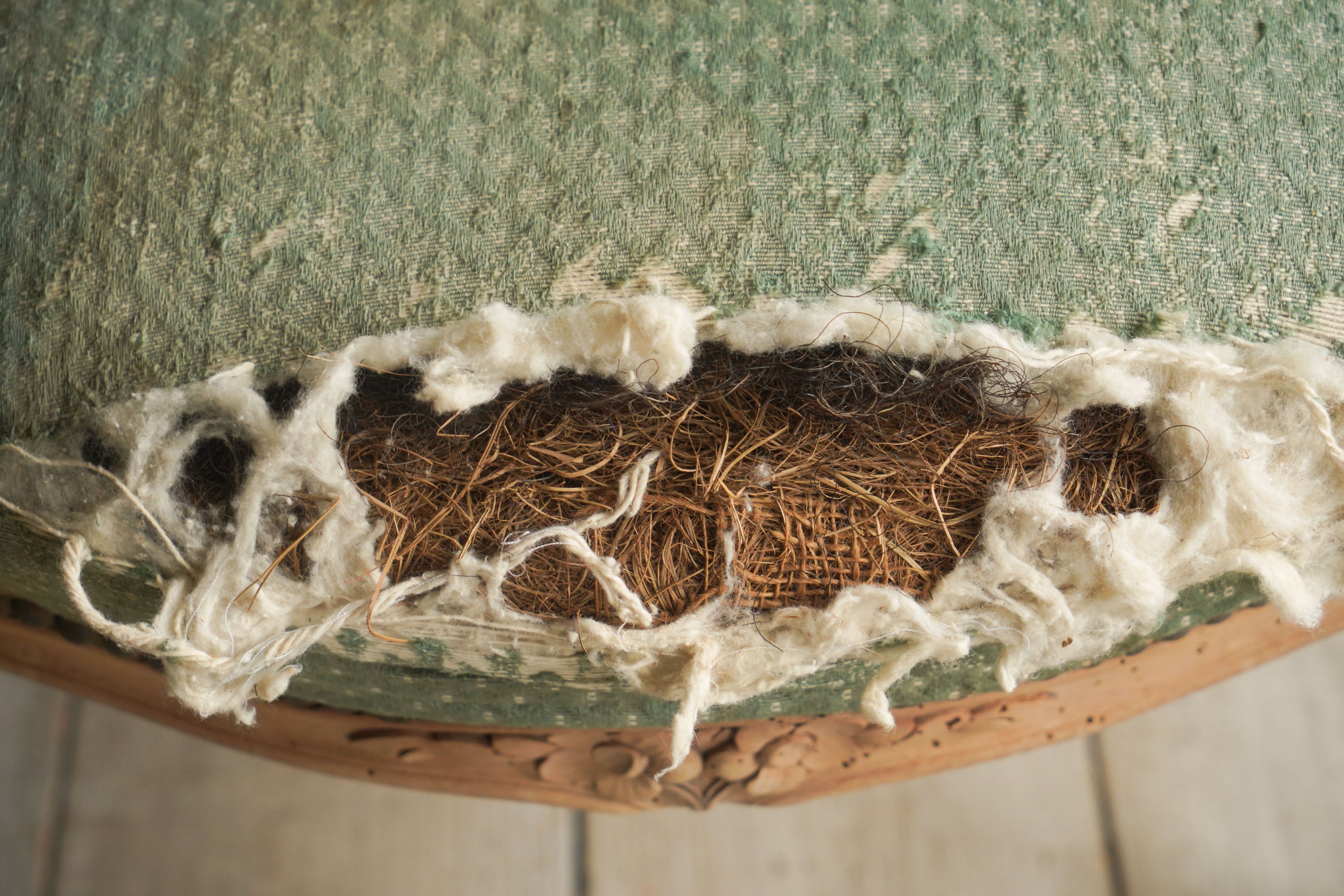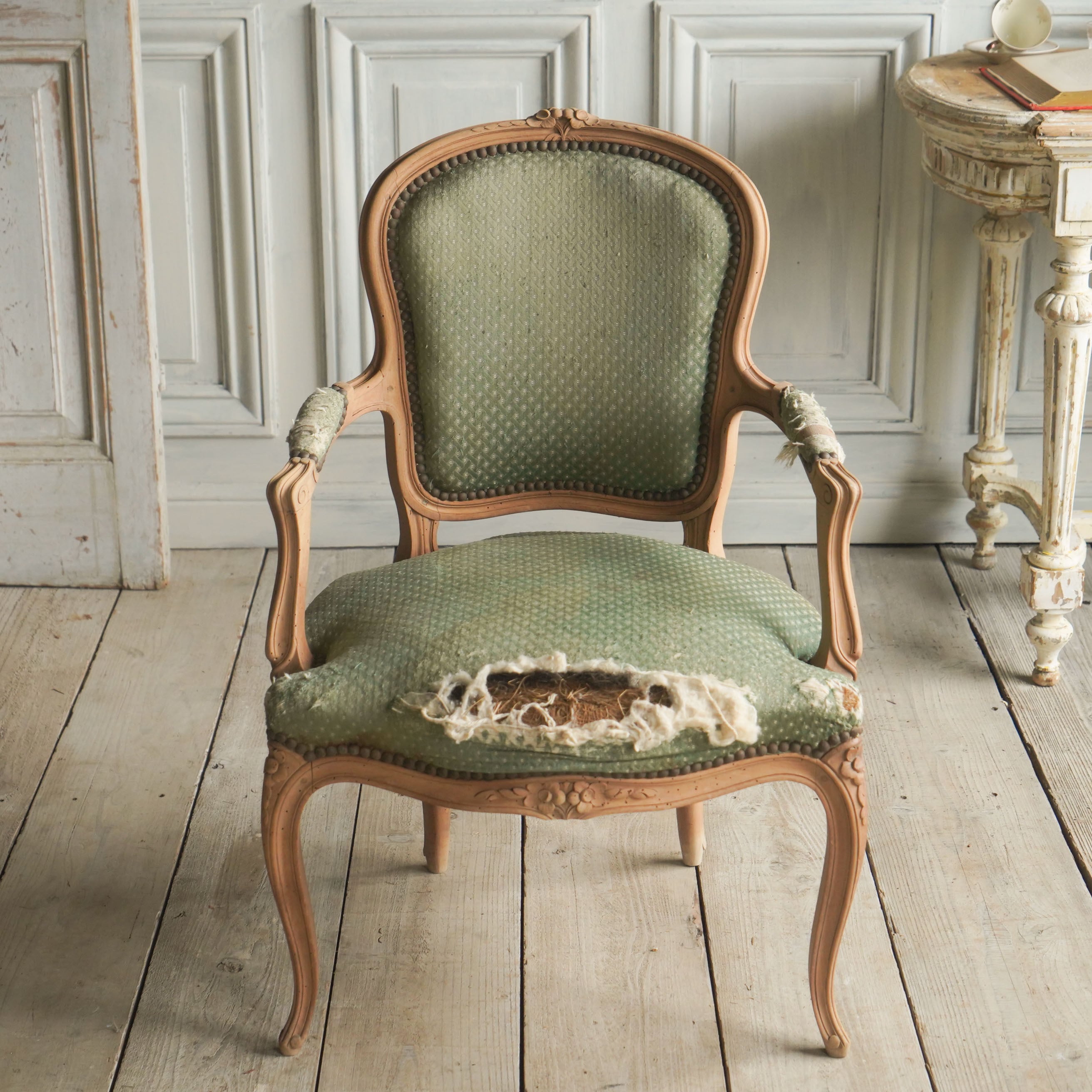 フレンチアームチェア/チェア/ディスプレイ/空間装飾/ウォールナット/緑/剥離/アンティーク/椅子/イス/ソファ