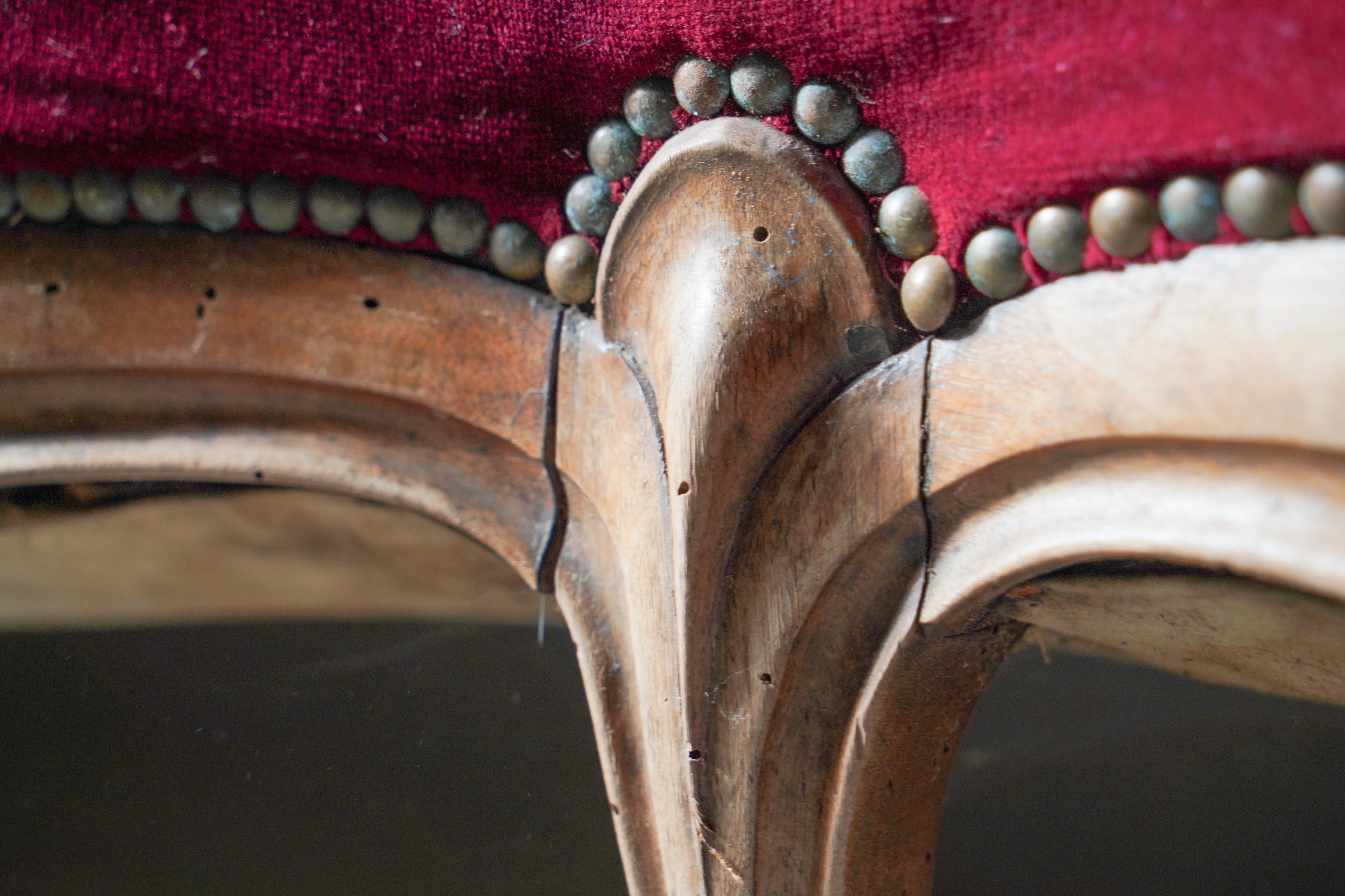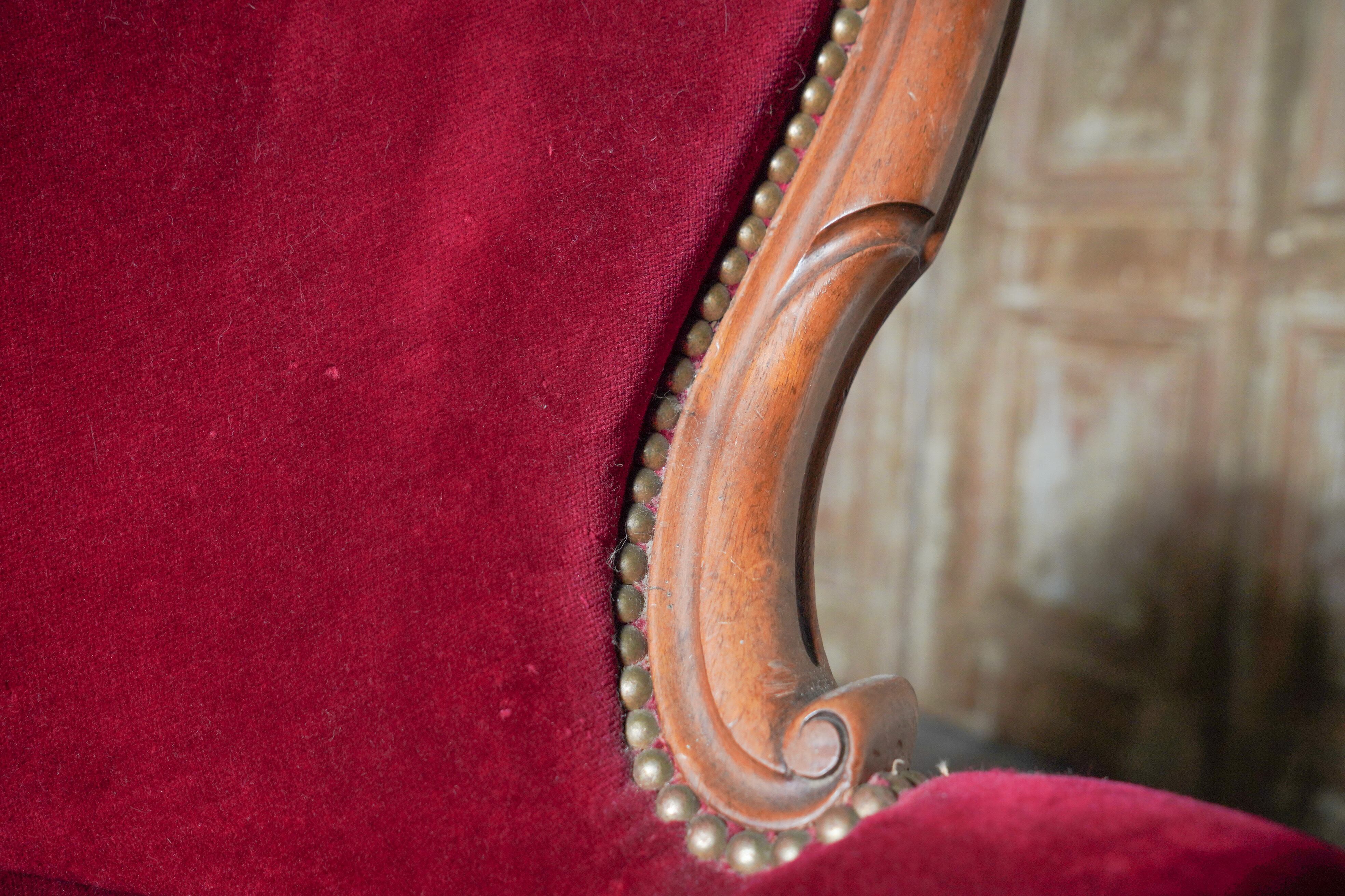 情熱的なレッドのベルベットが目を引くアンティークソファ。